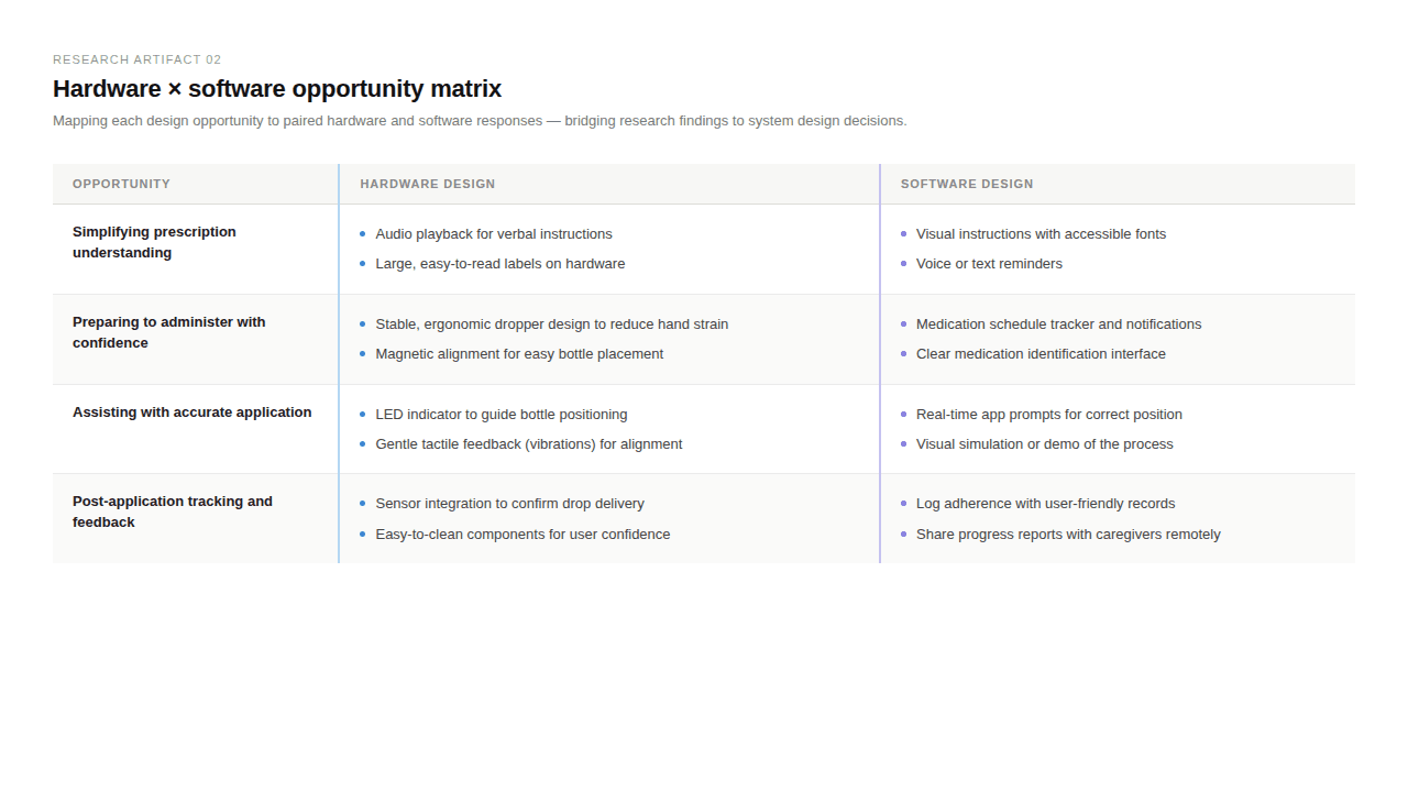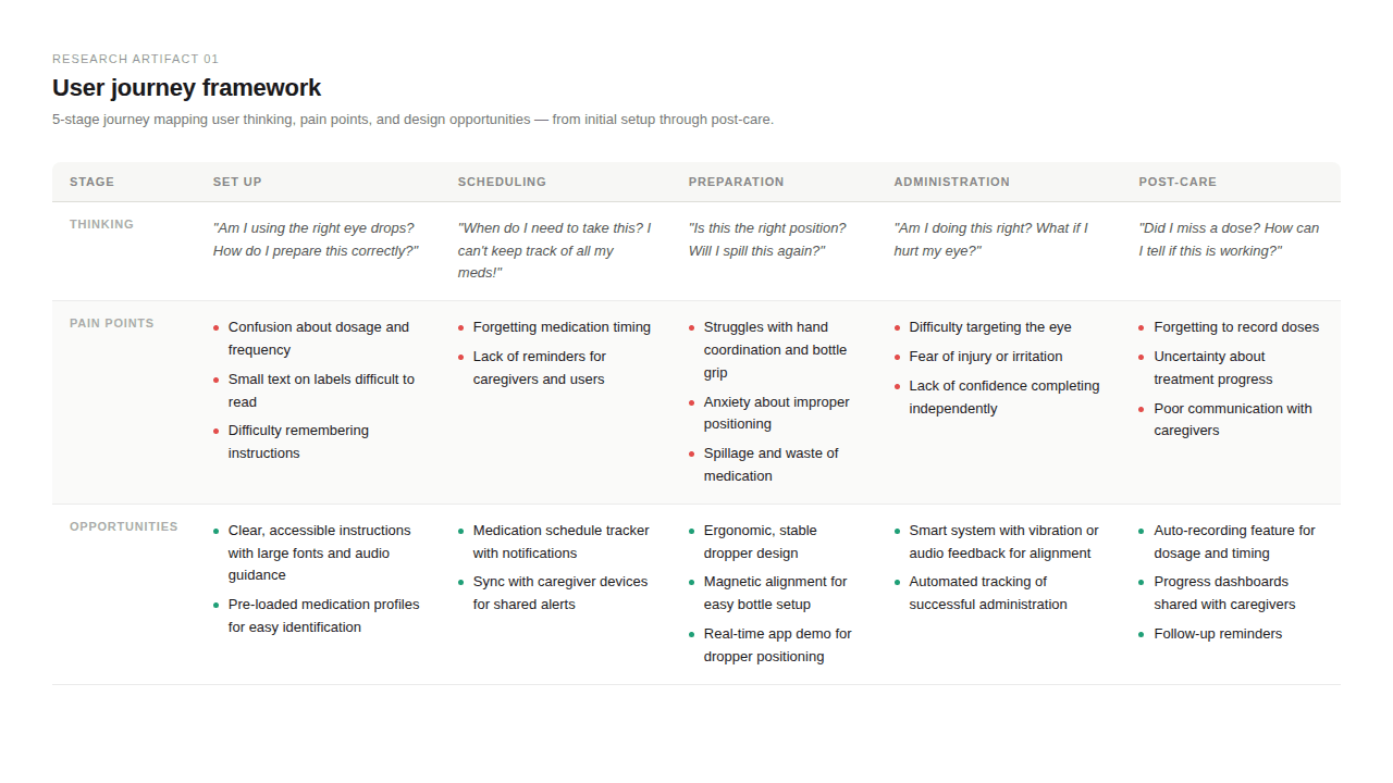 Research pushed us toward a counterintuitive principle: design for the moment when the screen doesn't matter. During drop administration, the user's eye is closed, their head is back, and their hands are occupied. Any interface that required visual attention at that moment was the wrong solution.