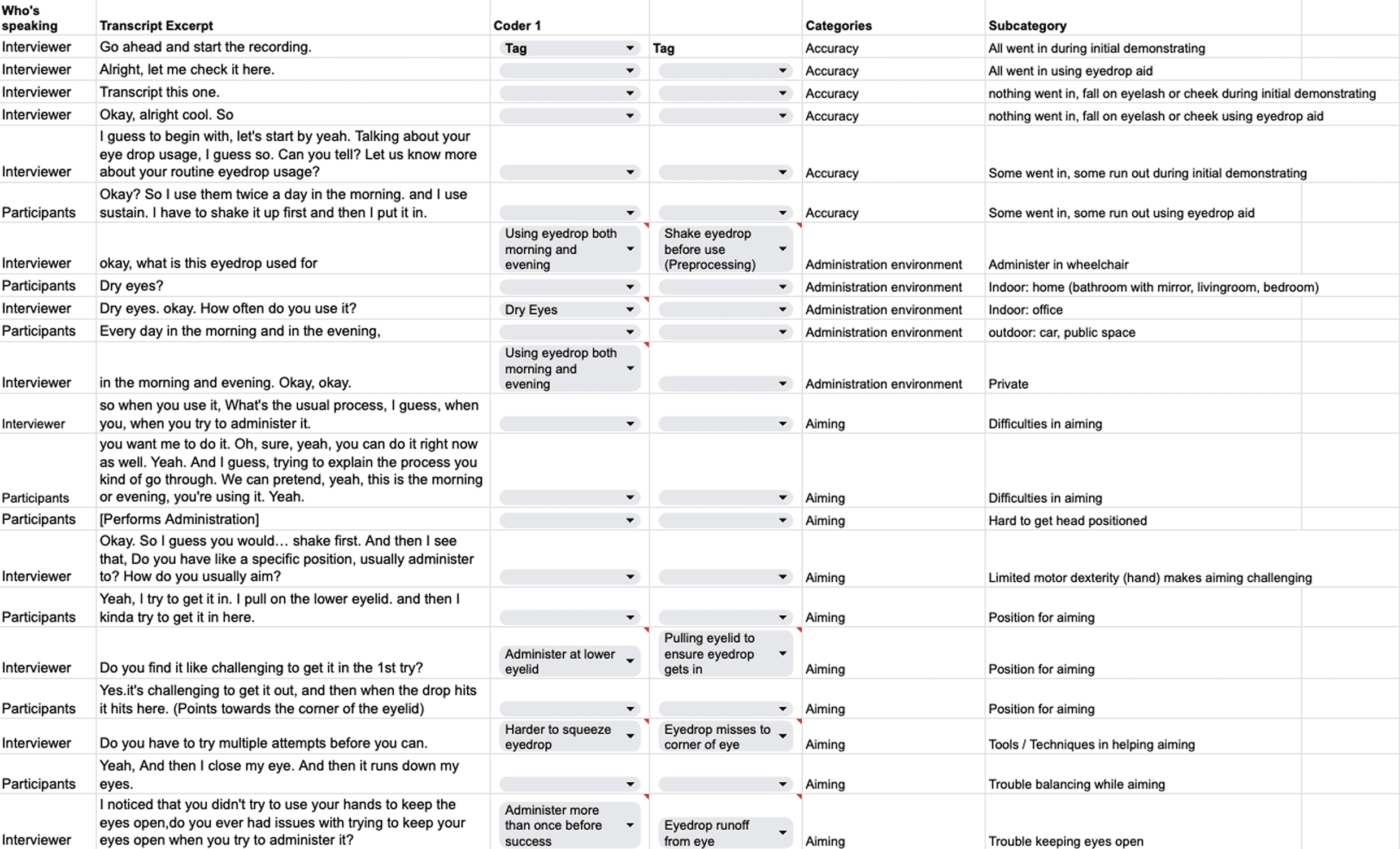 Left: coded interview transcripts — tagging aiming difficulty, motor dexterity, administration environment.